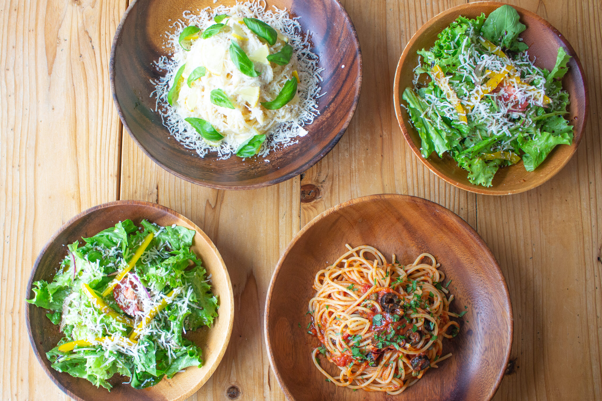 今回はランチパスタセットをいただきました。〈パスタ・サラダ・ドリンク〉のセットメニューです。パスタは10種類、ドリンクは約13種類から選べます。