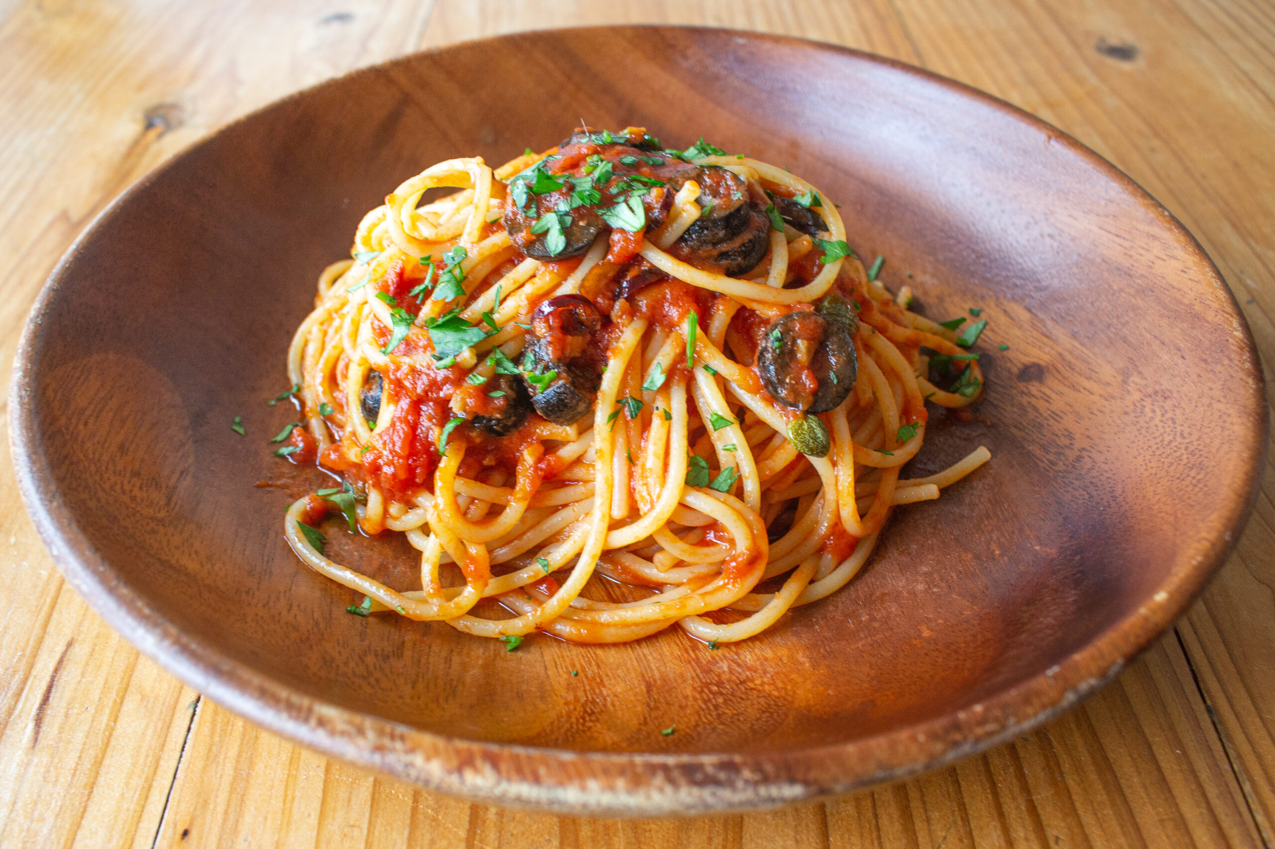 トマト、アンチョビ、オリーブ、ケッパ、鷹の爪のパスタ。