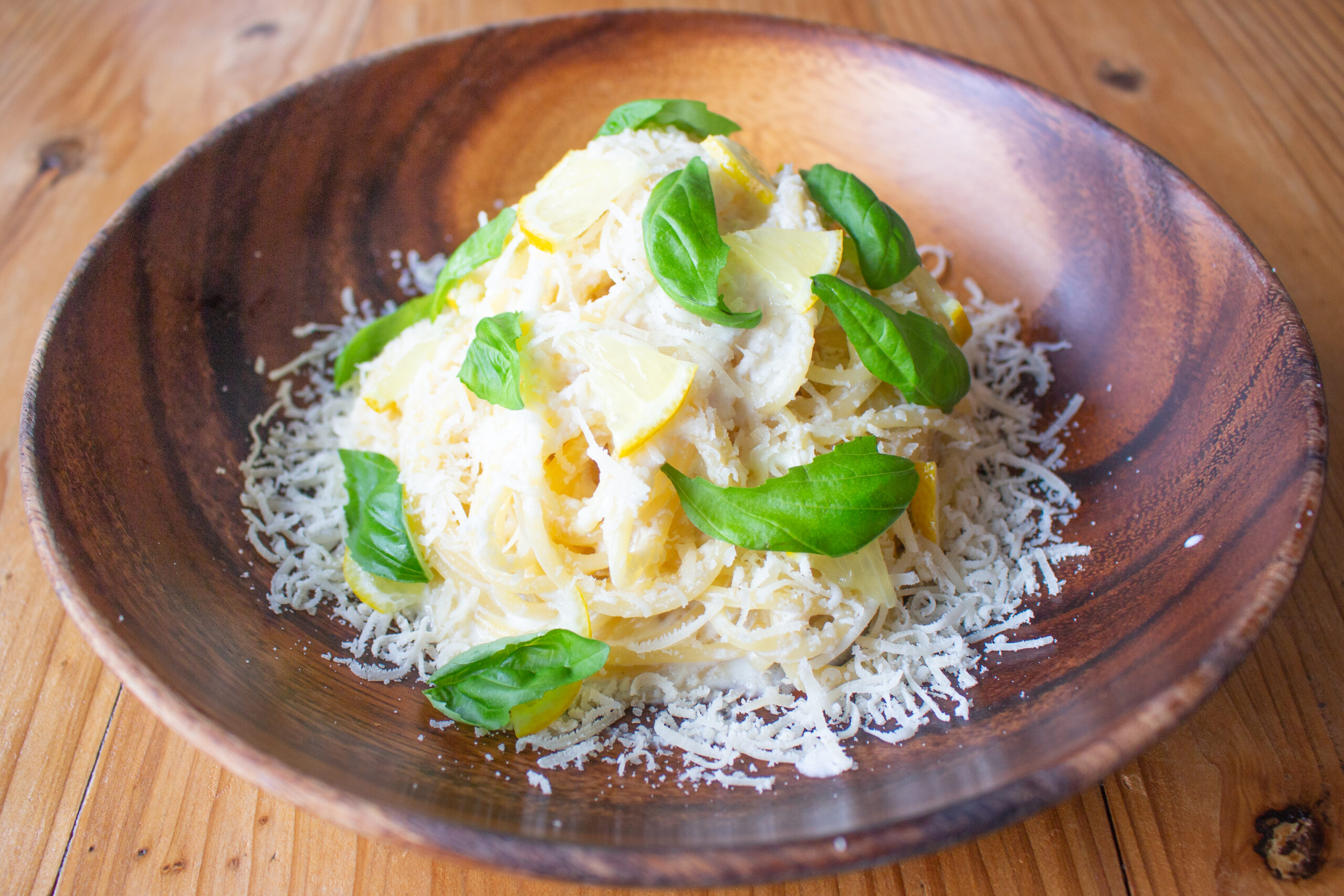 レモン、パルミジャーノチーズ、バジルのシンプルでまろやかなパスタ。