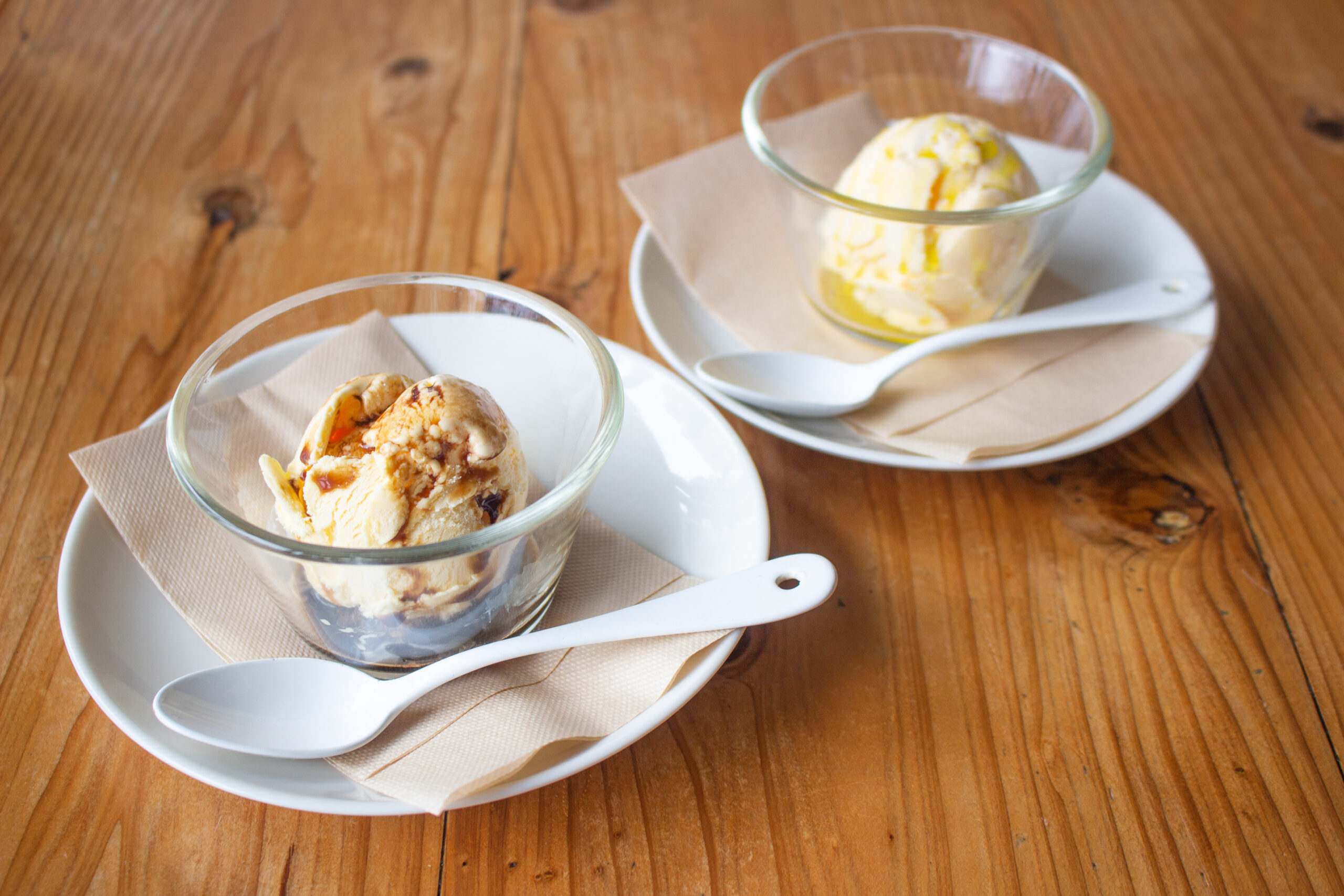 左)バルサミコ酢トッピング。バルサミコ酢の酸味がバニラと溶け合うと、なんとベリーのような甘さを感じられます。一度食べたら忘れられない、新感覚のおいしさです。