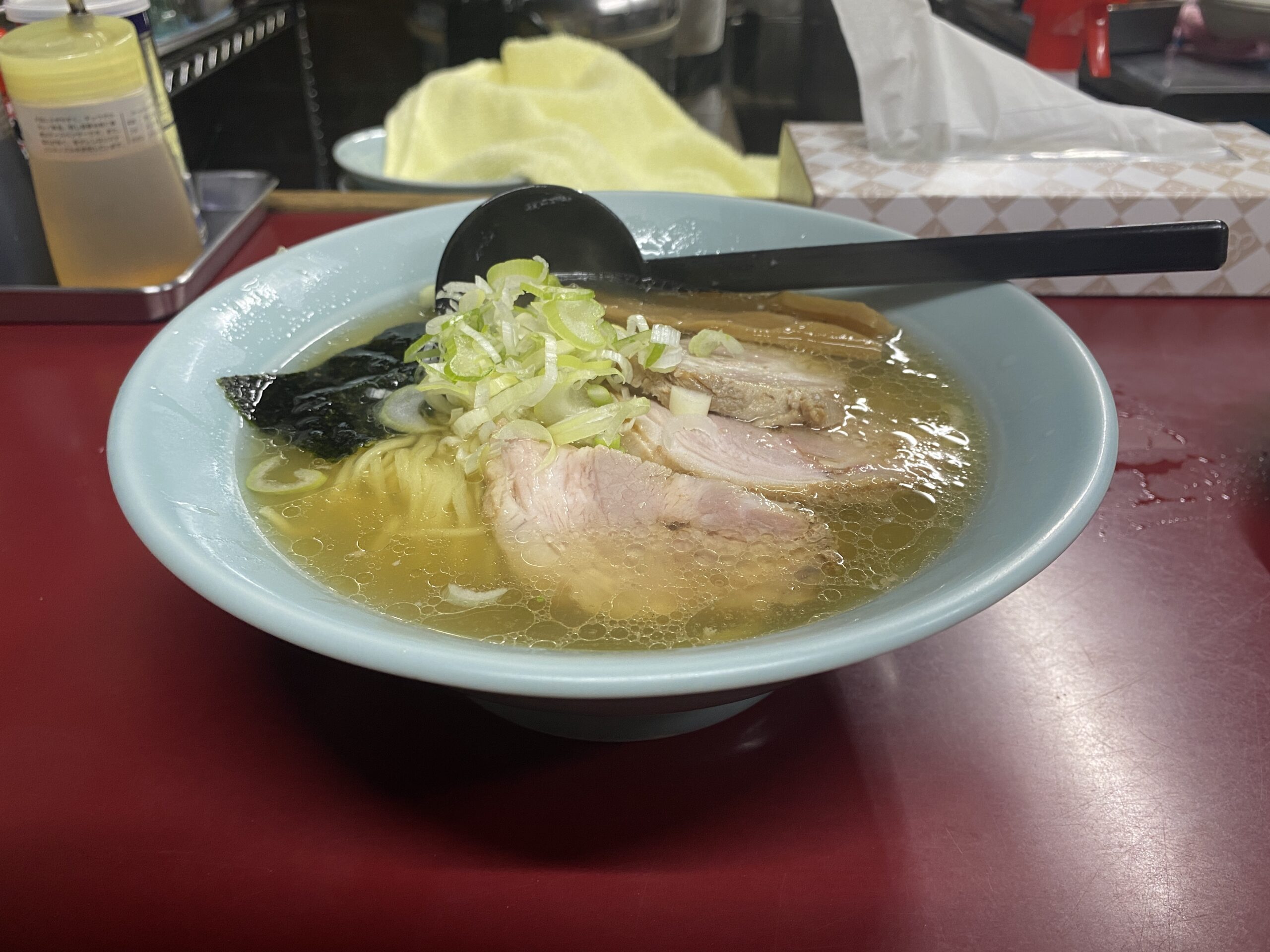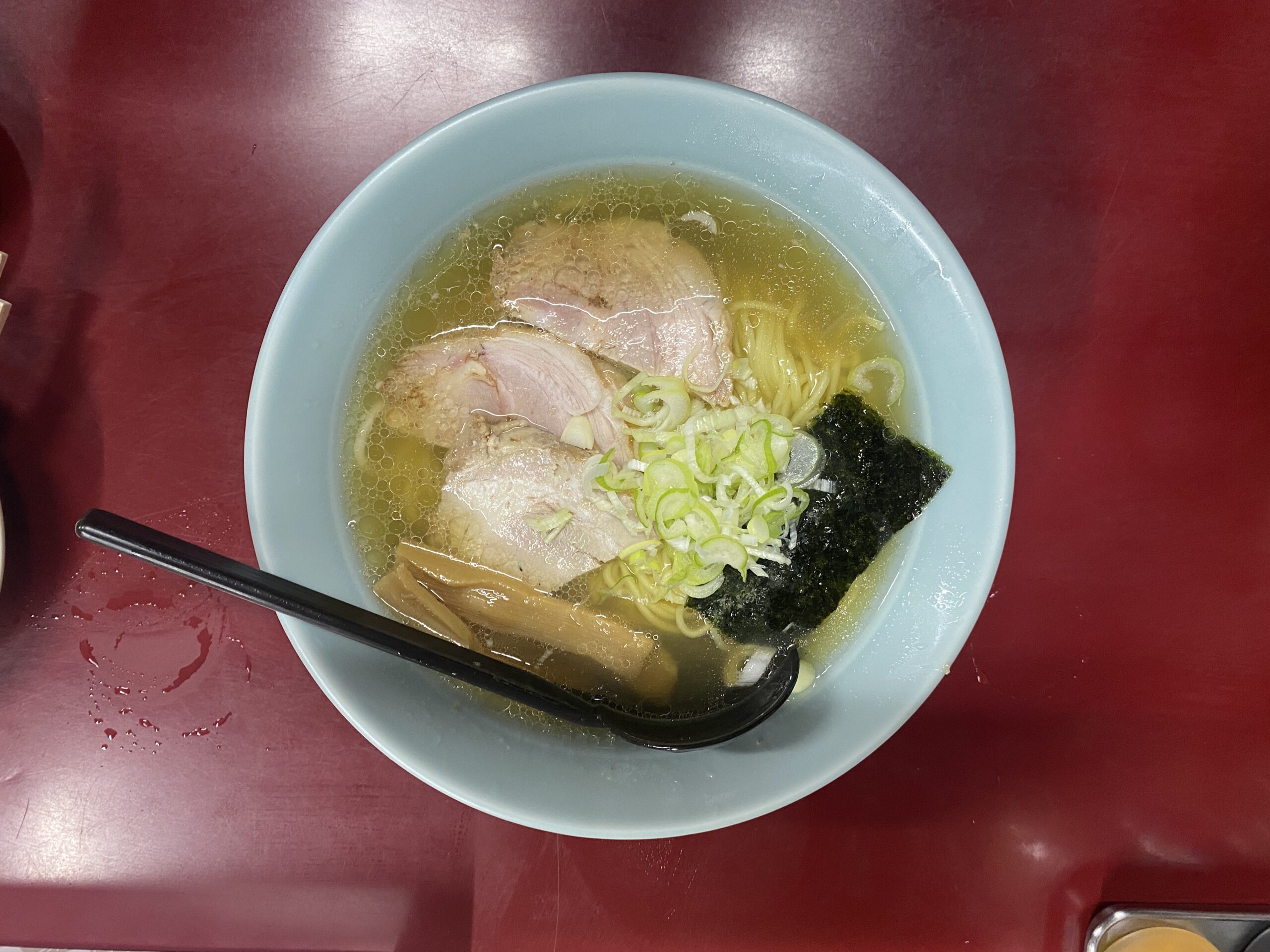 「透明なラーメンのスープはいくら飲んでも良い」というマイルールがあるので、遠慮なく塩スープを飲ませていただく。止まらん。